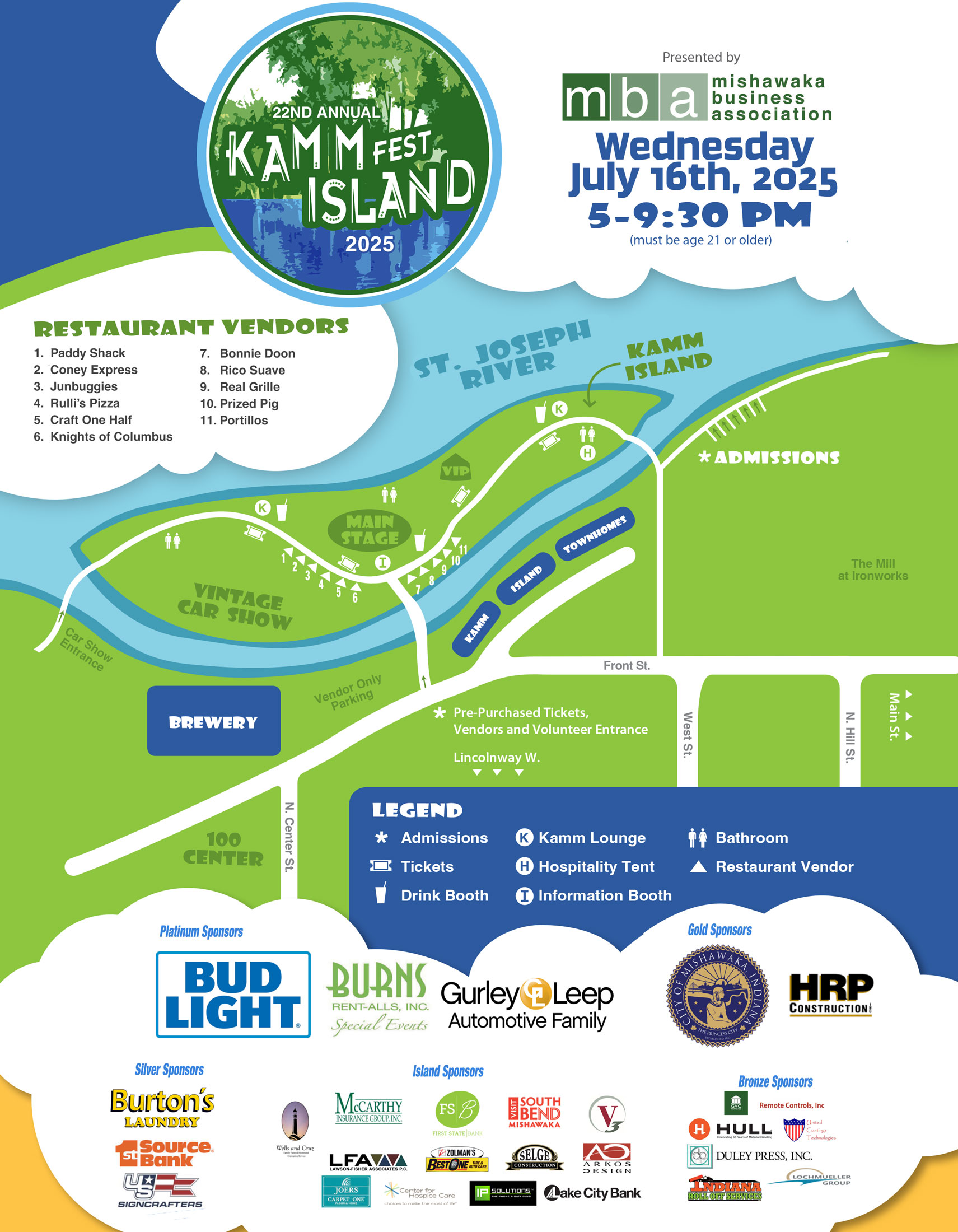 Kamm Island Fest remains a highlight of Mishawaka’s summer, celebrating the unique heritage of Kamm Island and the Mishawaka River Walk. Proceeds from the festival benefit local community and charitable organizations, as well as support the ongoing efforts of the MBA. As the primary fundraiser for the MBA, the success of Kamm Island Fest is crucial for continuing our mission to serve and advocate for our members.